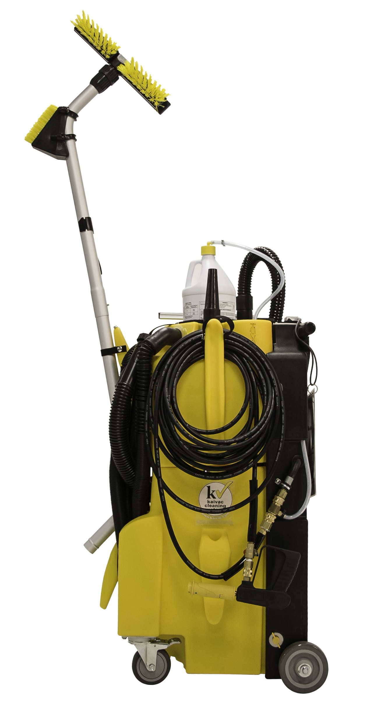 El Kaivac 1750 es perfecto para áreas grandes y pequeñas. Cuenta con un agua dulce de 17 galones y un tanque de recuperación de 17 galones. El sistema funciona con 500 p.s.i. bomba y un potente aspirador húmedo / seco de 3 etapas.